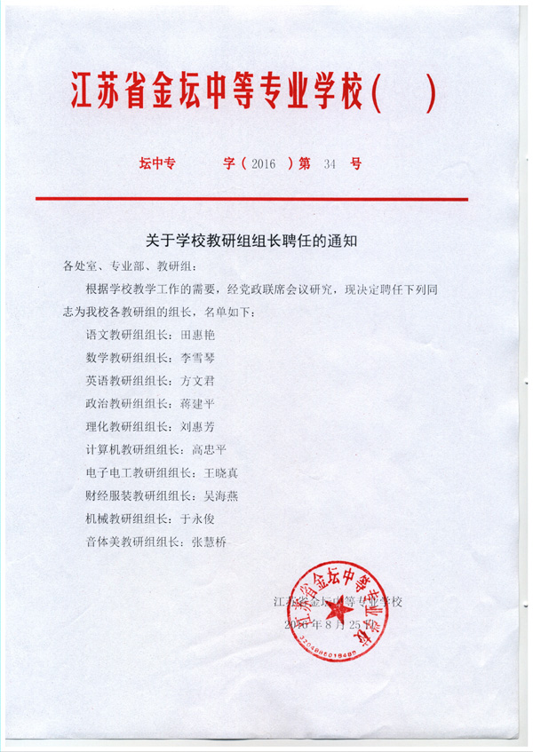 根据学校教学工作的需要,经党政联席会议研究,现决定聘任下列同志为我校各教研组的组长(详见附件)。
