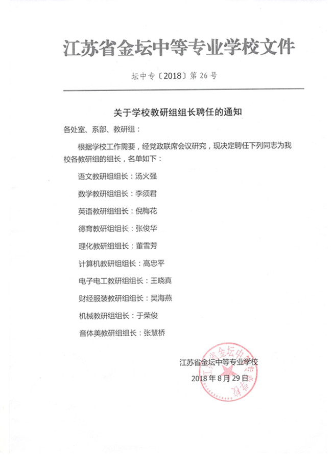 公示:关于学校教研组组长聘任的通知