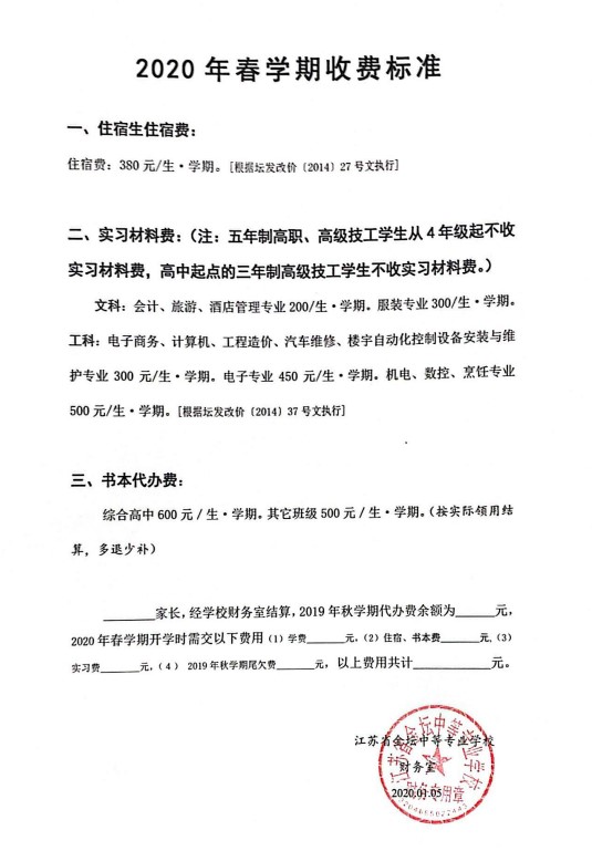 2020年春学期收费标准
