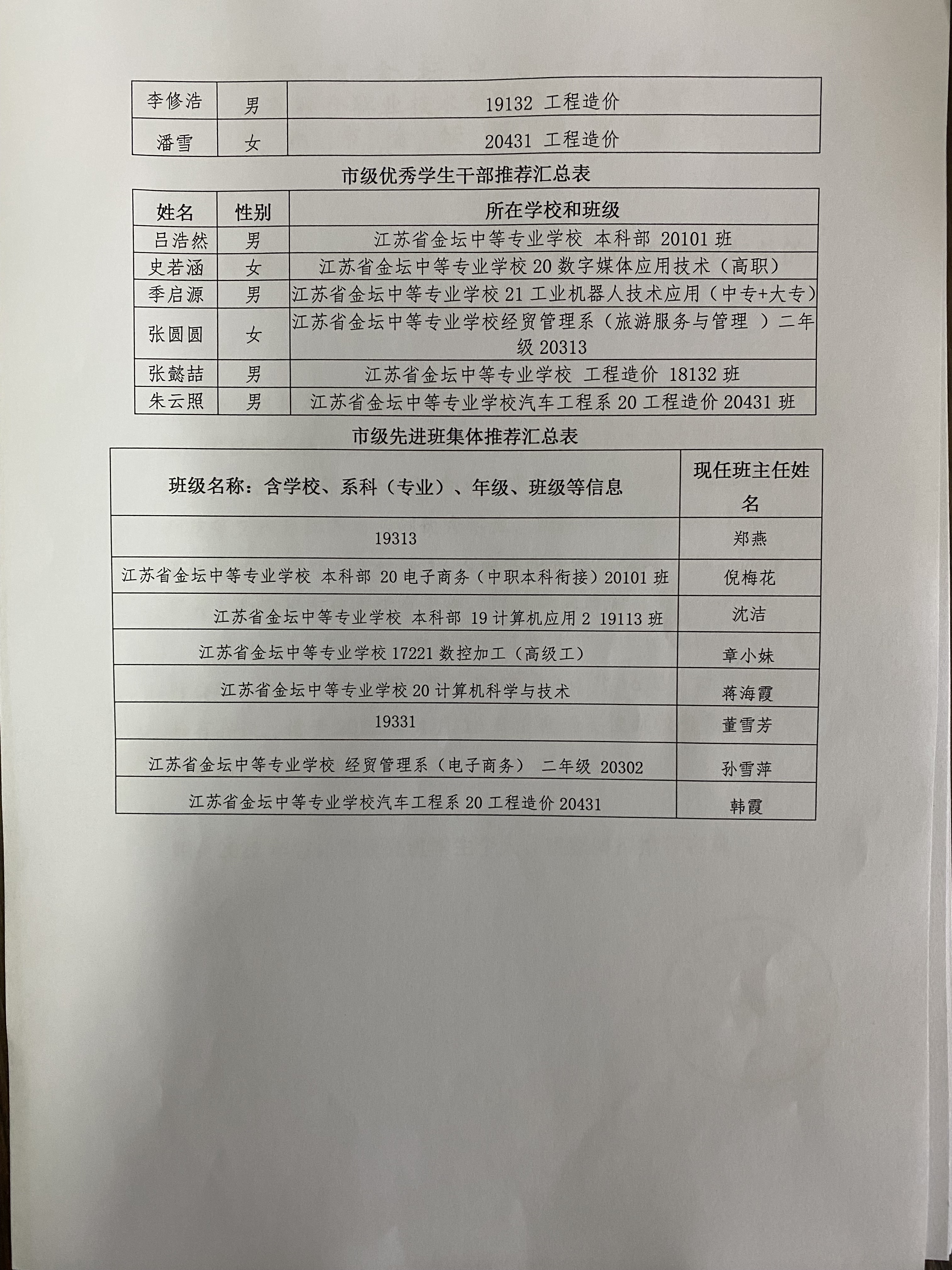 2022年省、市级先进学生个人、班集体拟推荐名单公示