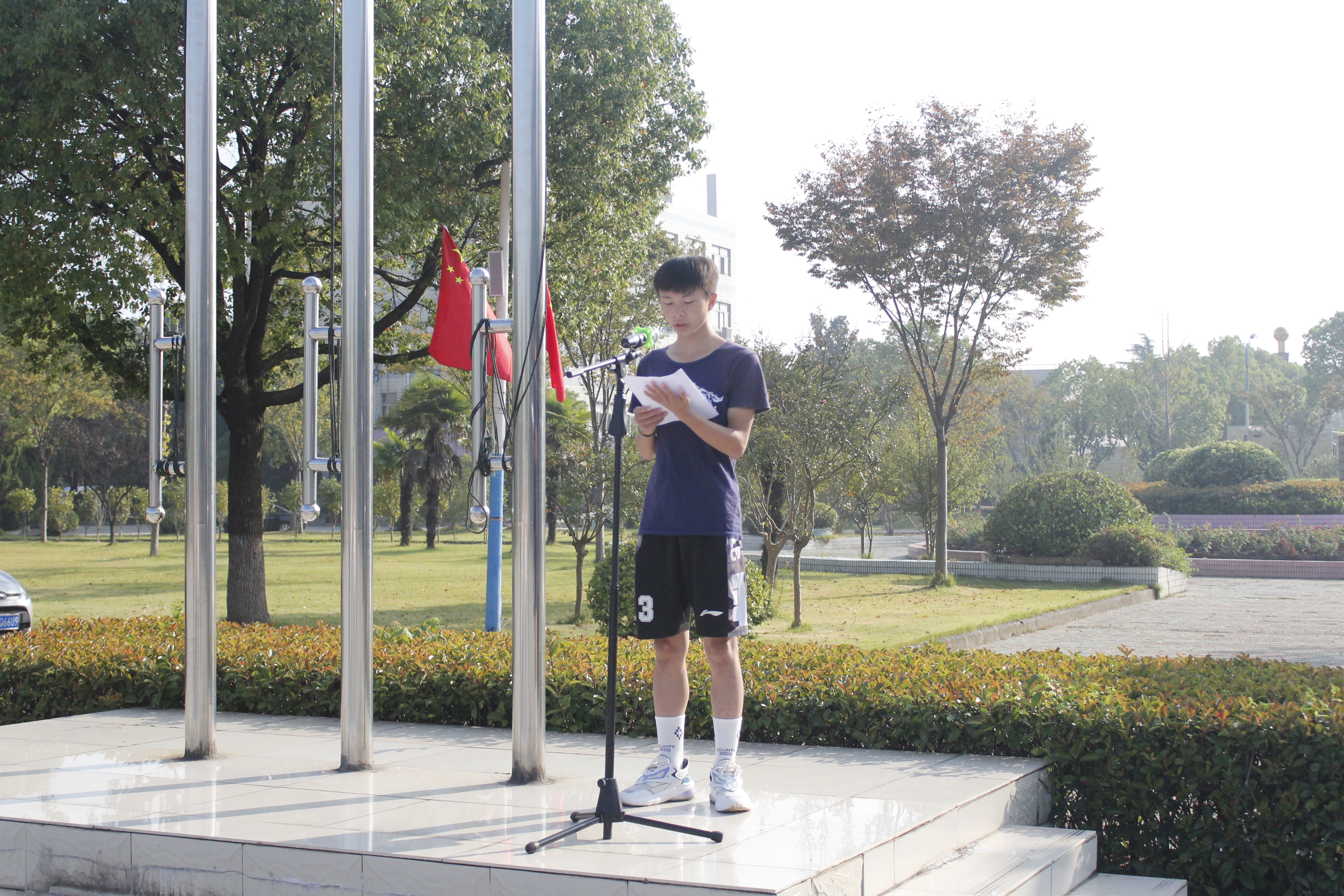 学生代表齐兴前发表了爱国演讲。他表示,十月一日是洗刷耻辱的日子,是庆祝胜利的日子,更是让我们缅怀先烈勿忘国耻的日子,国旗国歌激励着大家奋发图强、自强不息,同学们应该自觉行动起来,珍惜学习机会,树立远大理想,成为一名合格的社会主义接班人。