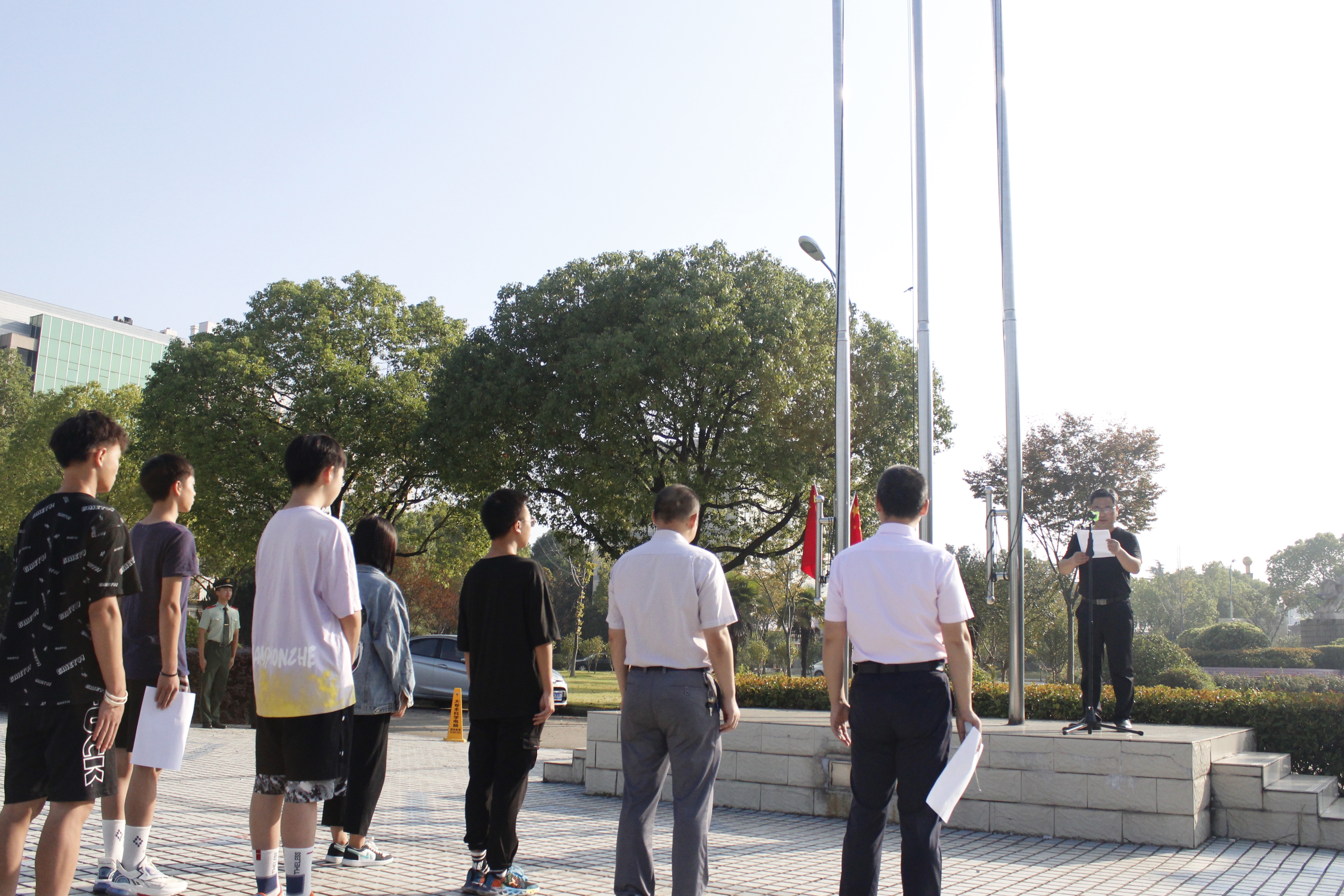 为大力弘扬爱国主义精神,认真贯彻《新时代爱国主义教育实施纲要》,广泛开展“四史”宣传教育,激发青年学生爱国热情,在举国共庆建国72周年之际,在党总支的组织领导下,我校于国庆节当日举行了“我和我的祖国”庆国庆爱国主义教育系列活动。我校党总支委员、汤英俊副校长、学工处李志斌处长、团委鲍彤副书记、曹雨平老师、国旗队升旗手及国庆假期留校的11名外地学生参与了本次活动。校团委鲍彤副书记主持了系列活动。