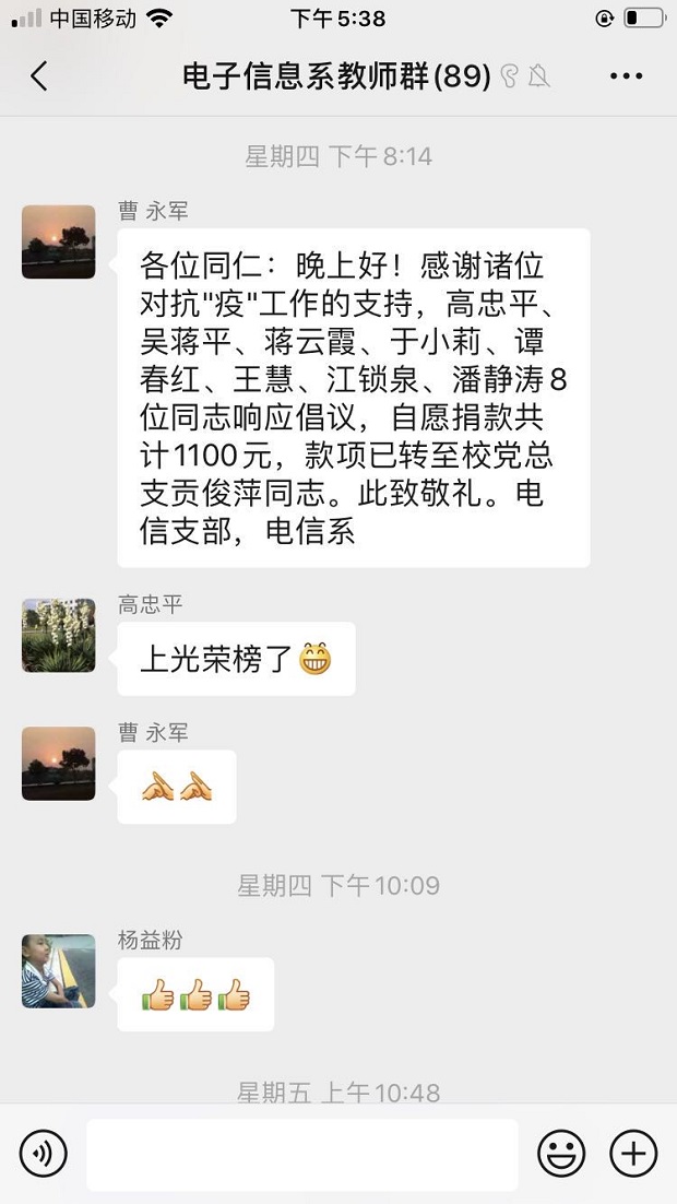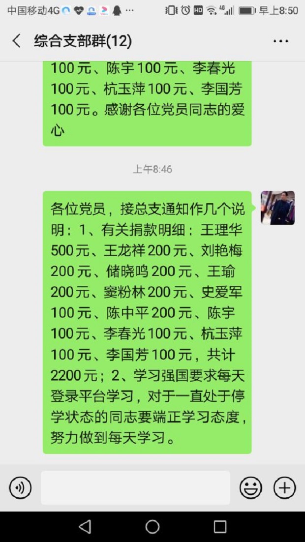 我校退休党员每天通过各种媒介关注疫情最新情况,对一线抗疫人员充满着崇敬和关爱,当看到我校党总支的自愿捐款倡议书后,他们主动打电话询问捐款事宜,以表达自己的真情和对一线工作人员的关爱。在捐款活动中,老党员们闻令而动,无论身处何地、家境如何,积极捐款,表达爱党爱国之心,彰显了老党员应有的政治品格和思想境界。
