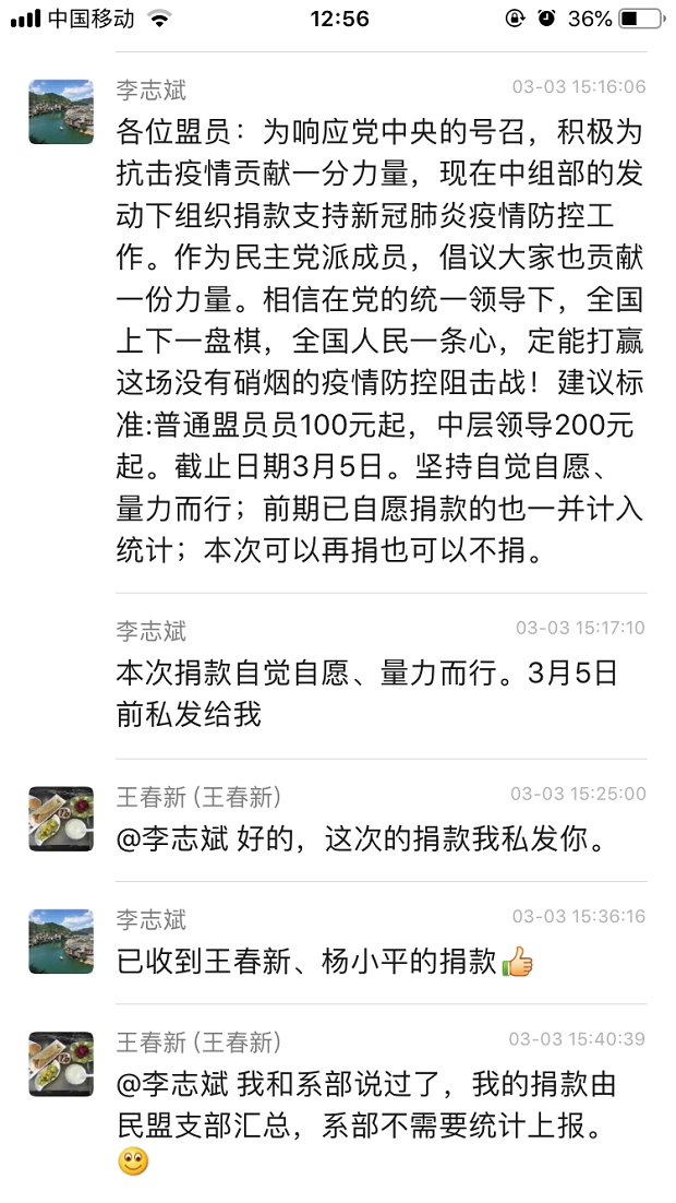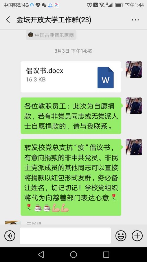 生命重于泰山,疫情就是命令,防控就是责任。在党总支的领导下,我校民盟支部也积极行动起来了。在李志斌主委的组织下召开了名盟支部电话会议,向盟员们发出自愿捐款倡议,盟员们积极响应,一致表示要增强”四个意识”、坚定”四个自信”、做到”两个维护”,在中国共产党的坚强领导下,发挥优势,主动作为,和全区人民一道,为打赢这场抗击新冠病毒疫情的战斗贡献盟员力量!
