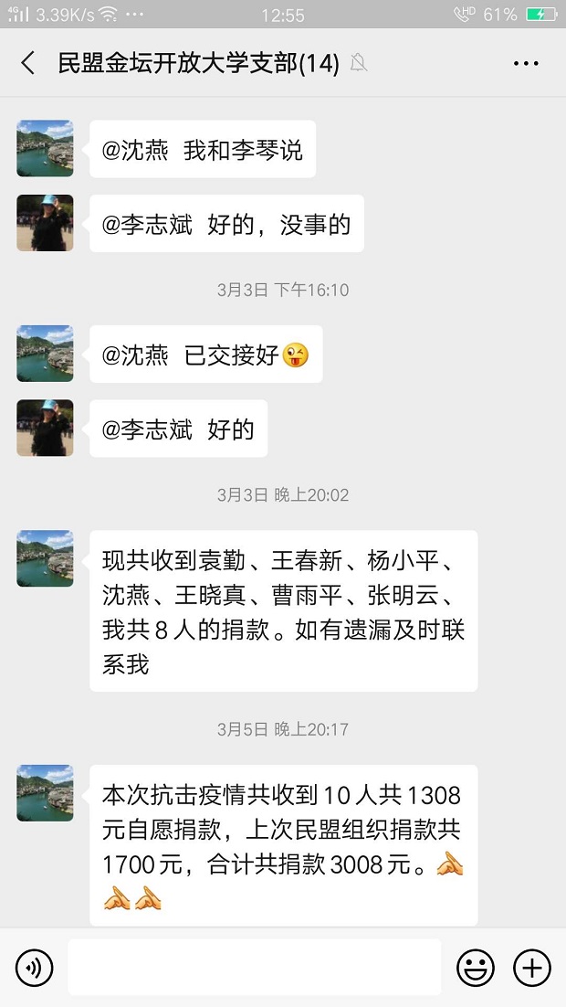 盟员们自愿进行了两次捐款,第一次向盟市委、金坛区防疫指挥部捐款1700元,第二次捐款1308元,合计共3008元。定向用于防疫工作,为抗击疫情助力加油。