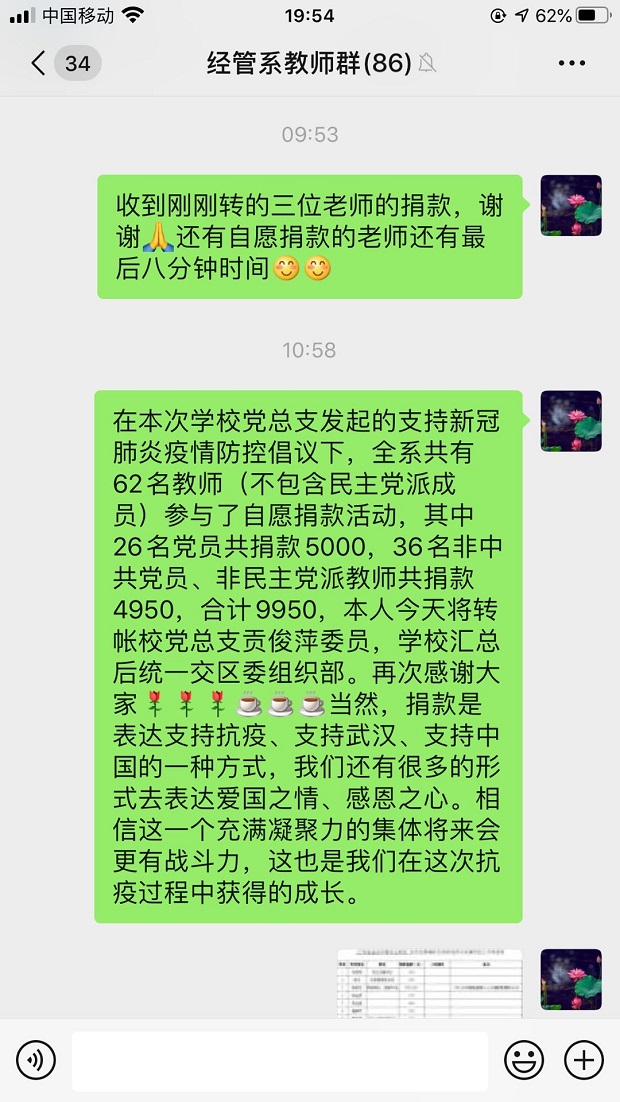 新型冠状病毒肺炎疫情,牵动着每一位党员的心,也牵动着非党员教师的心,他们关心疫情的进展,恪尽职守上好网课;他们与党员同步,自愿捐款,为祖国分忧、向勇士致敬,彰显出新时代教师的博爱胸怀。四个系部共有61名教师自愿捐款9316元,善款将用于防疫阻击战。