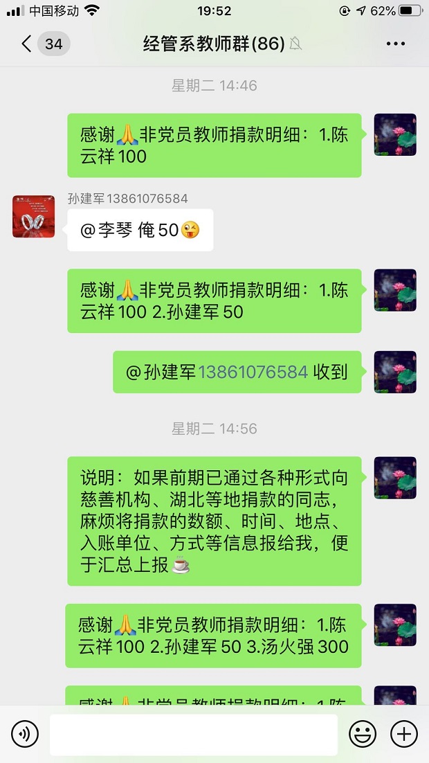 教师们不仅积极捐款,还通过各种渠道购买抗“疫”紧缺物资,送到抗“疫”最前线,许云峰老师就是其中的一个。他在疫情严重的时候给山西太原李华医生捐了150个口罩(折合人民币675元) ,真是雪中送炭,以别样的方式支持防疫防控工作。