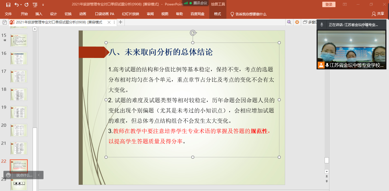 面对三月份常州突如其来的严峻疫情形势,刚入学不到一个月的高三年级的整体教学由线下转为线上,不少高三学子学习状态受到影响。经严格排查后,高三学生返校进行了封控管理,在江苏省对口单招高考迫在眼前的局势下,为了更大程度调动师生抗疫备考的积极性,提高教学效率,金坛中等专业学校本科部数学组和旅游管理专业分别于4月12日和4月14日下午进行了高三教研会议。