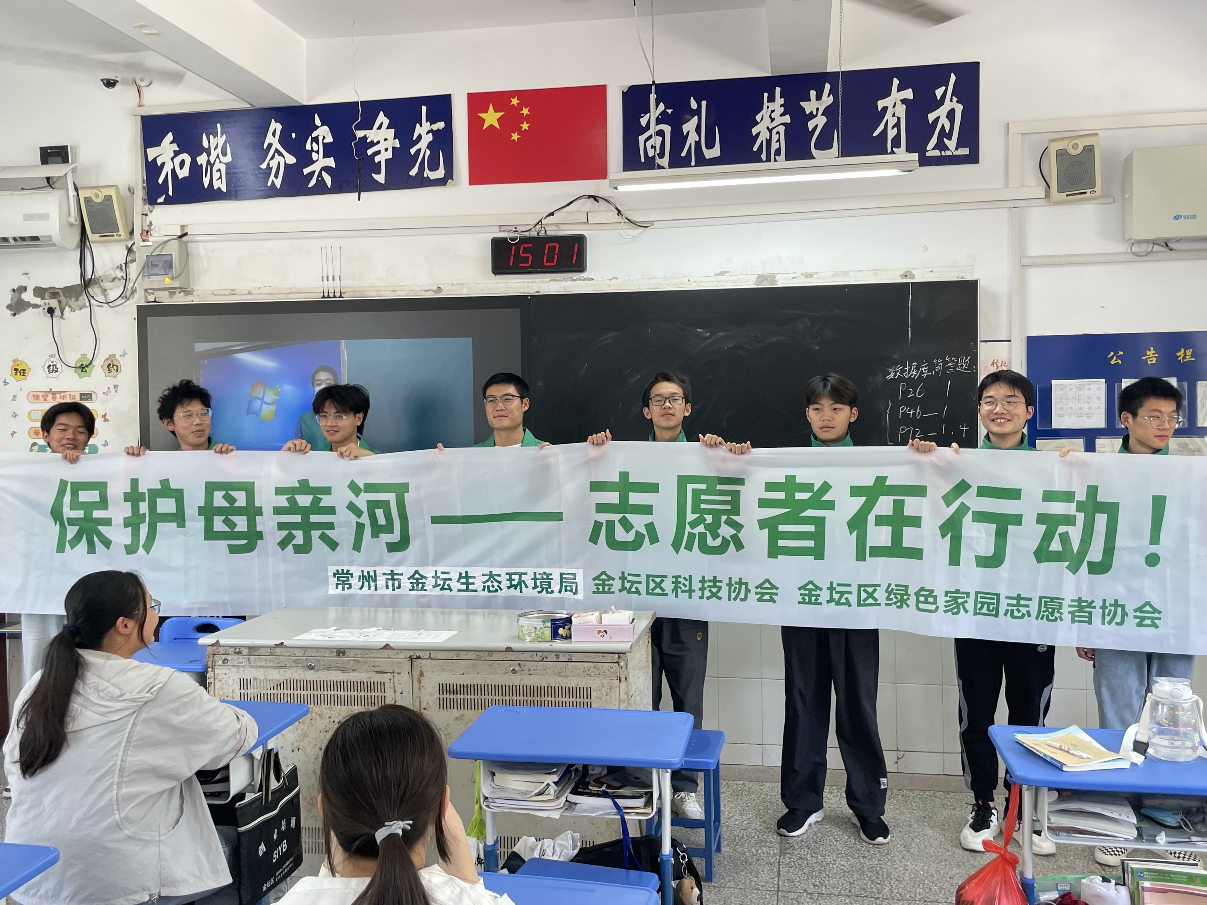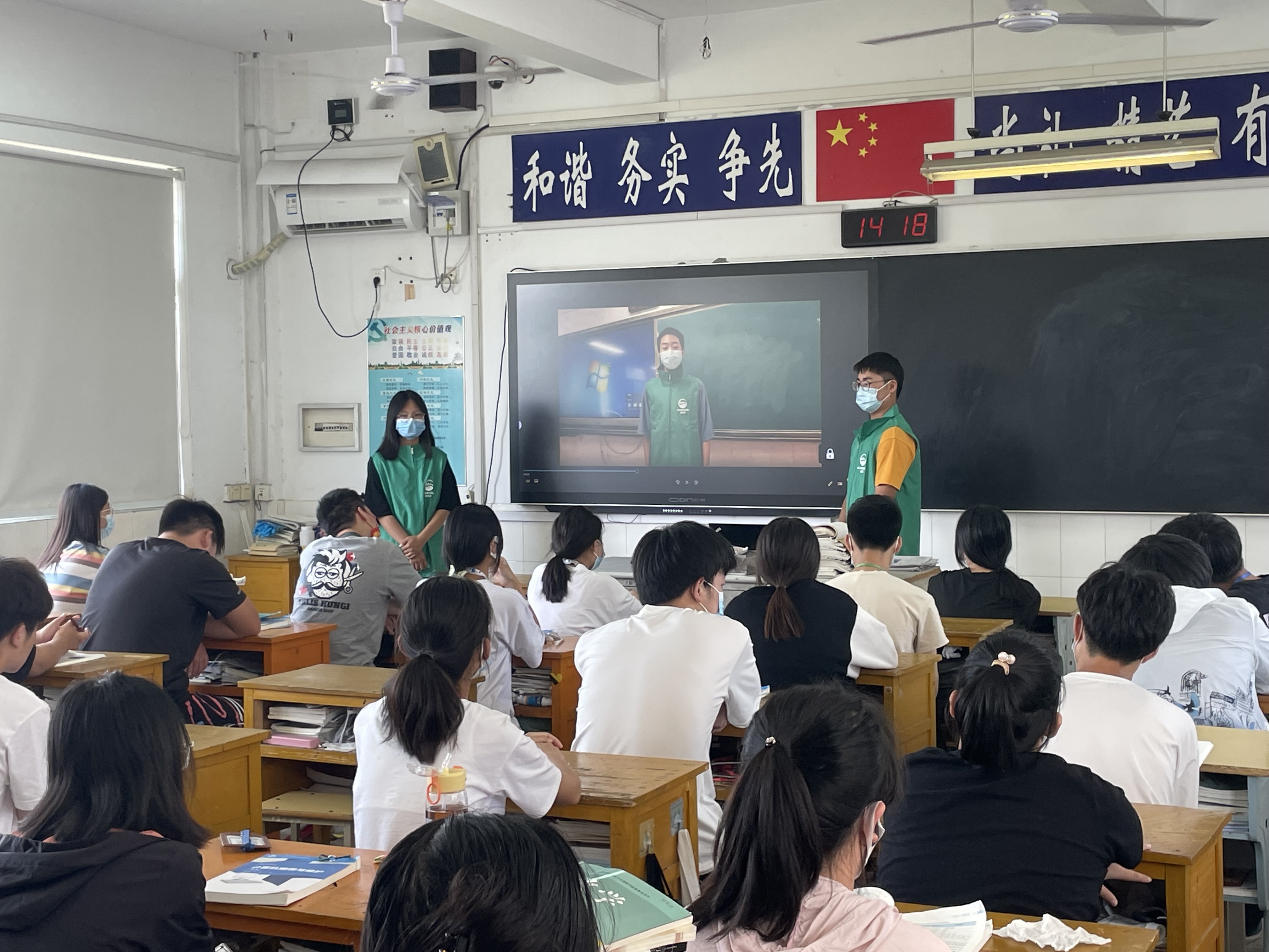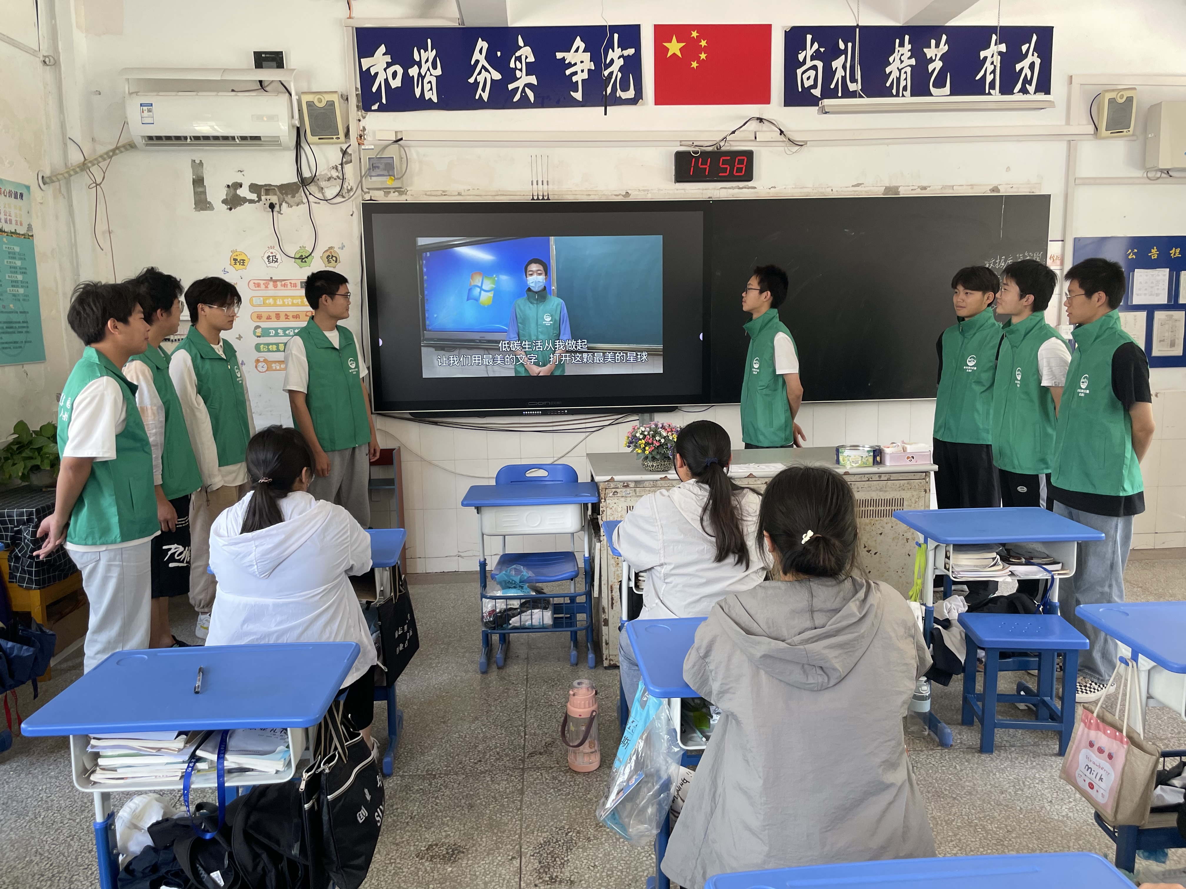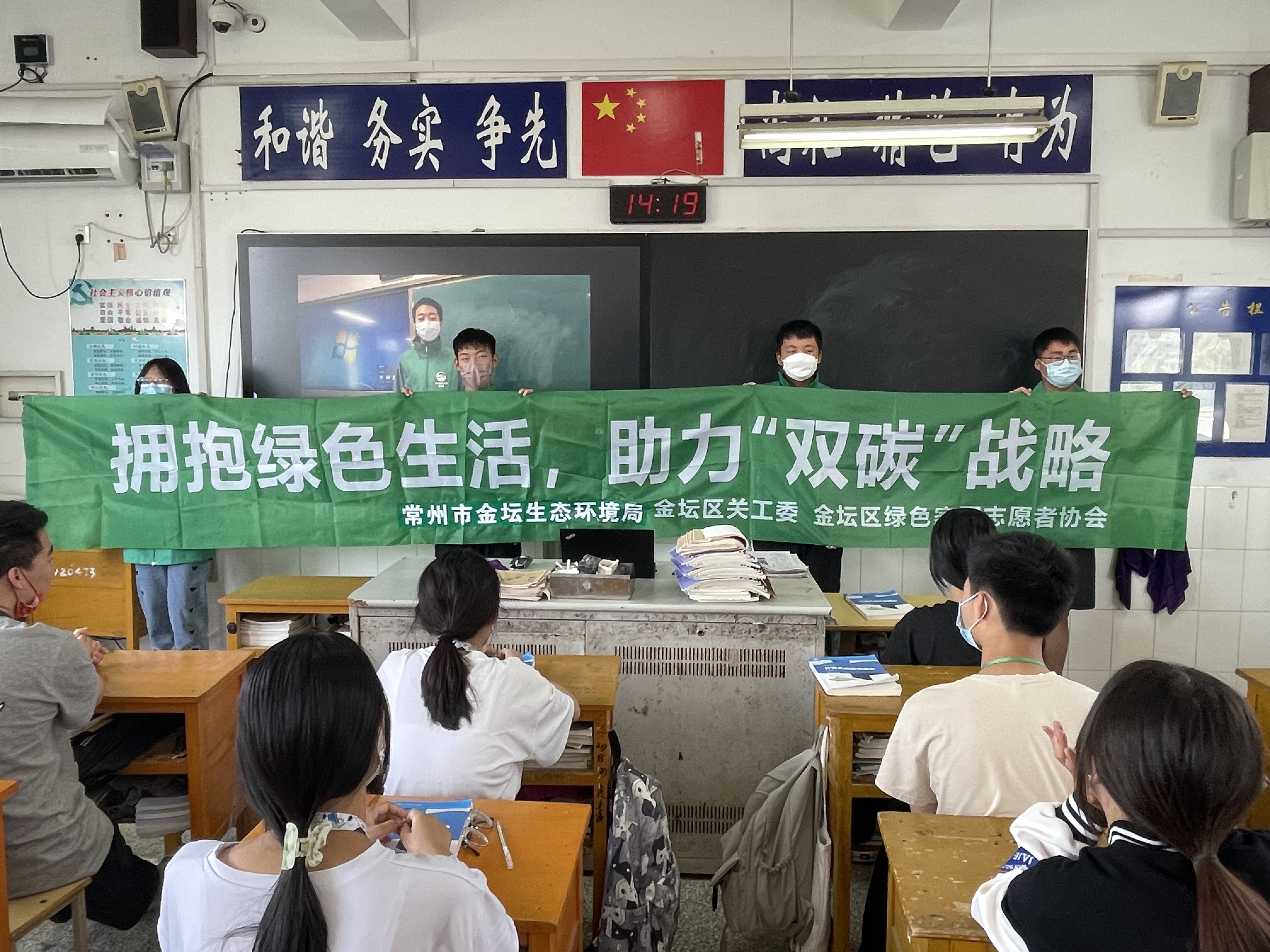 由于防疫要求限制,双碳战略宣传的志愿者进不了校园,我校自己组织部分学生志愿者,于6月15日带着拷贝的视频资料和横幅走进各班开展宣传活动。