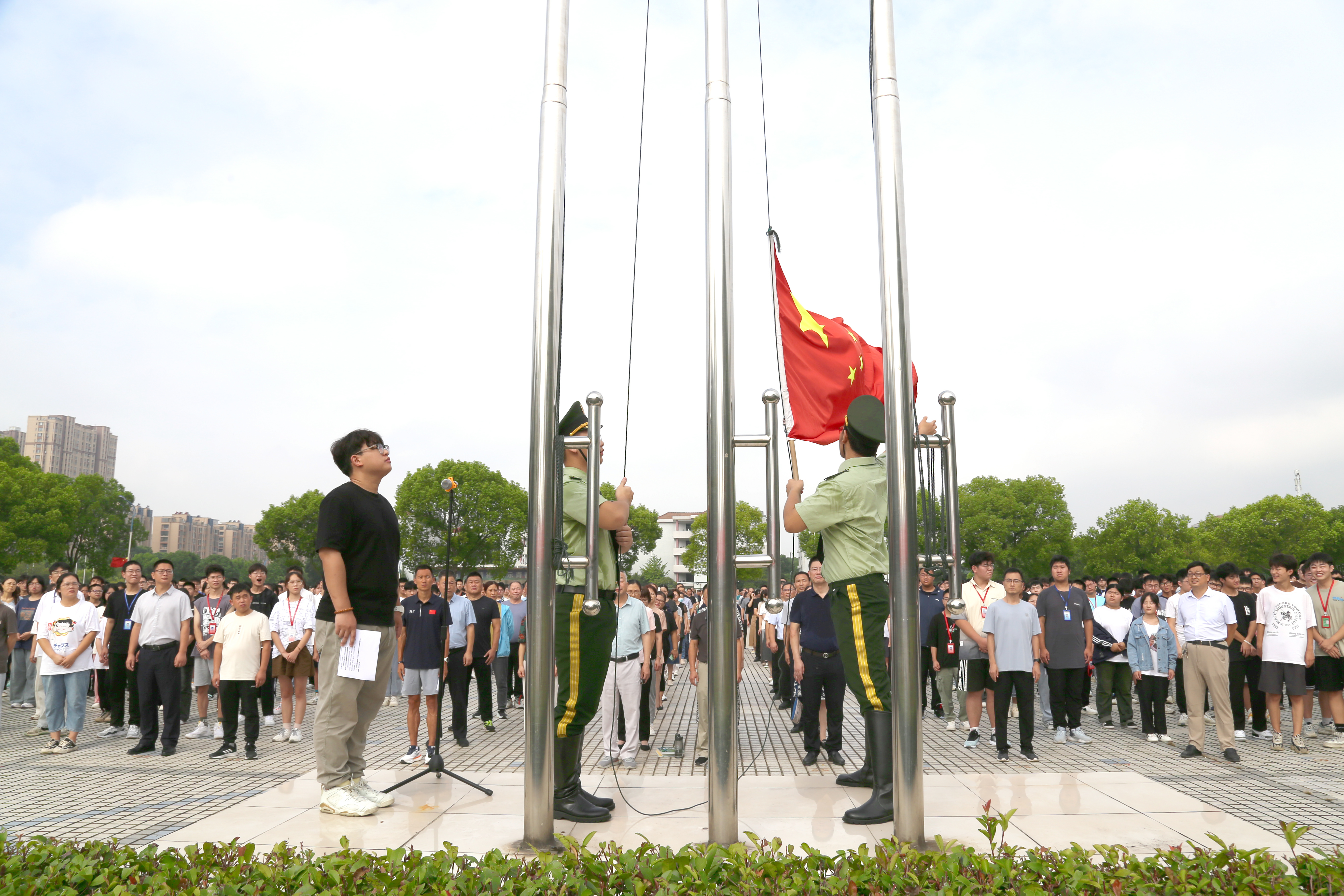 国旗护卫队在全校师生的注目下,踏着正步,徐徐走来。在慷慨激昂的国歌声中,五星红旗冉冉升起,拉开了开学典礼的帷幕。